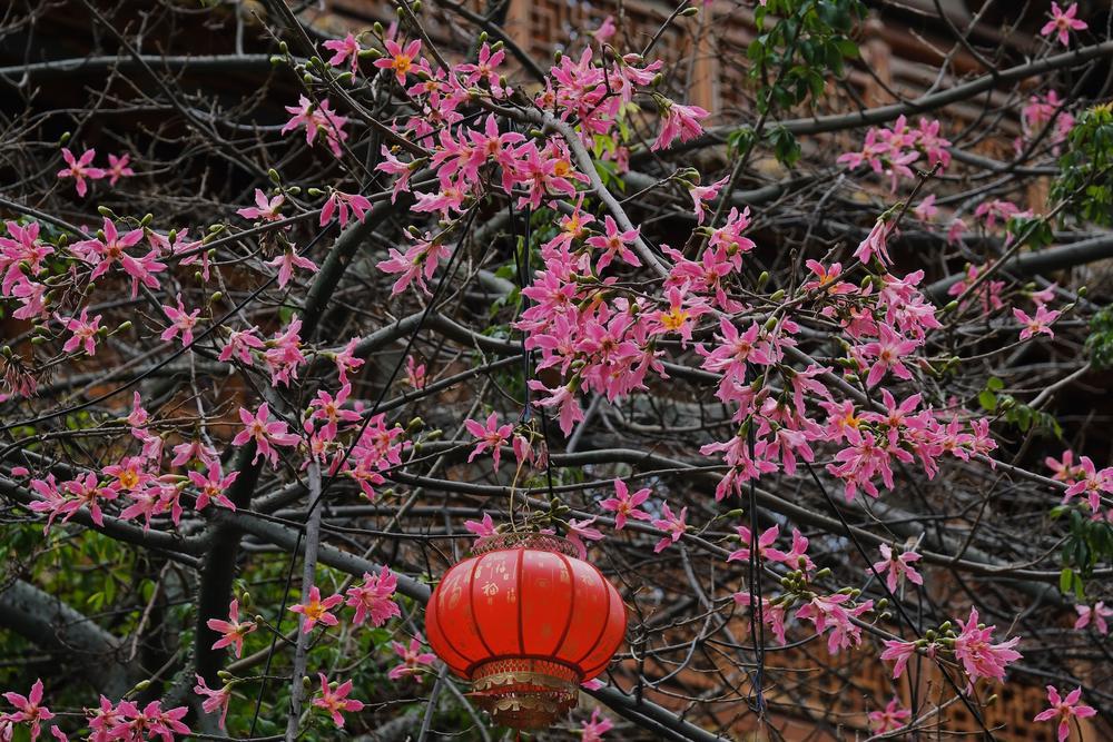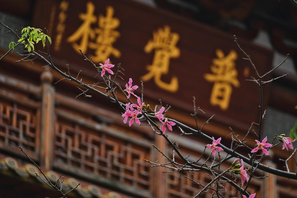 Lingnan: Beauty Beyond Borders | The flowering season of the #Kapok trees in #Guangzhou usually falls between October and December, known as the "romantic pink autumn" of the city. In the following spring, the fiery red Hero Flower and the Kapok take the stage and bloom. They blossom in front of the Grand Buddha Monastery on the west side of Beijing Road Pedestrian Street. With a gentle breeze, the Kapok flowers dance gracefully, resembling elegant pink fairies, complementing the ancient temple and creating a unique charm. Many passersby and tourists stop to take photos. Some locals say, "It's rare to see the beautiful chorisia speciosa and #Kapok blooming at the same time."