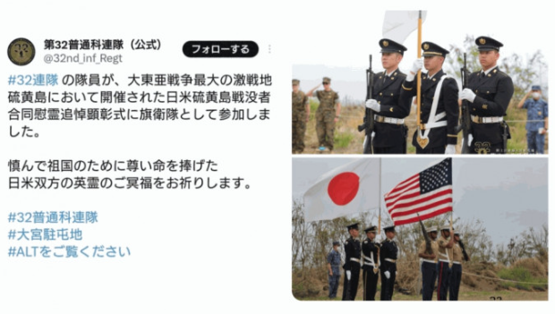 涉事连队为日本陆上自卫队第1师团属下的第32普通科连队,该队发文称队员参加了硫磺岛战役阵亡将士追悼活动,提到当地是“大东亚战争最大激战地”。