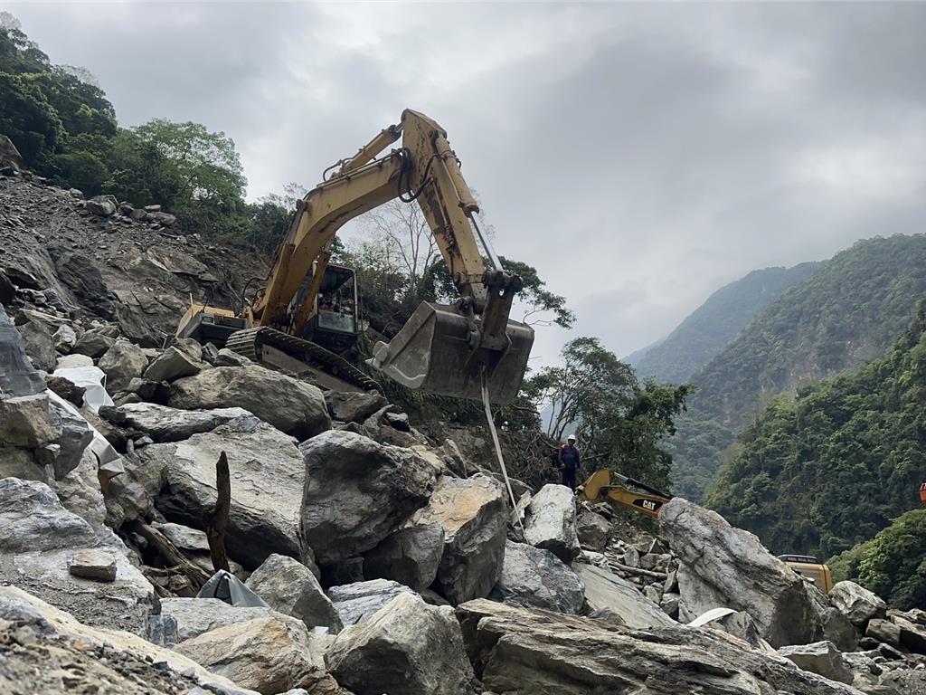 ▲重机具进驻太鲁阁砂卡礑步道,搜救人员今挖掘出2具罹难者遗体。