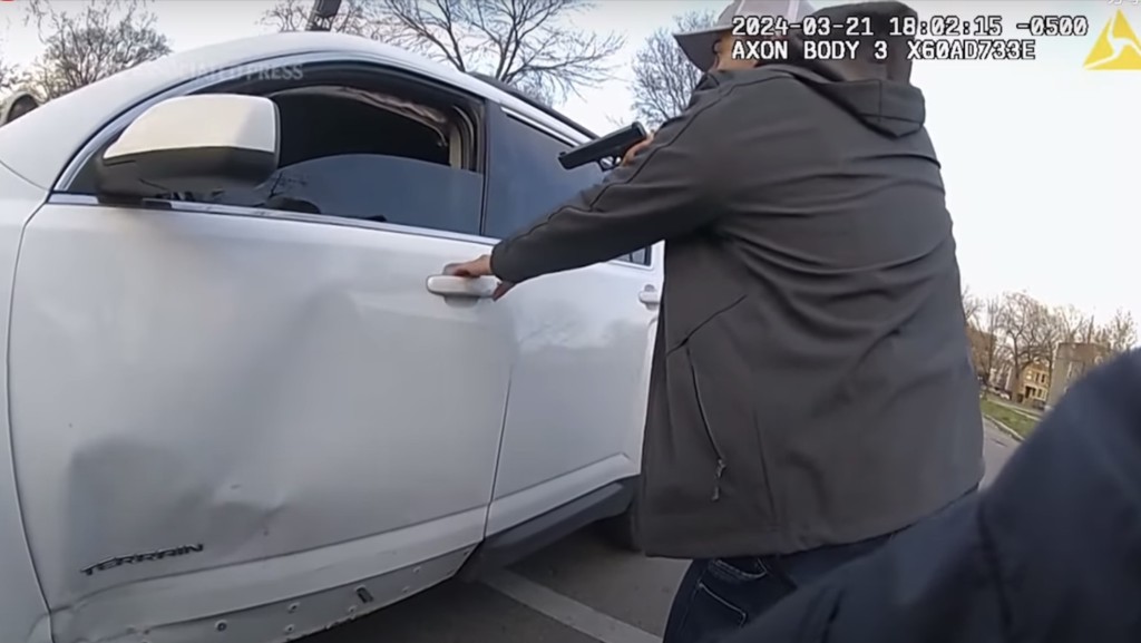 ▲其中一名警员举枪要求里德开门,当时车窗半降,车门打不开。 美联社