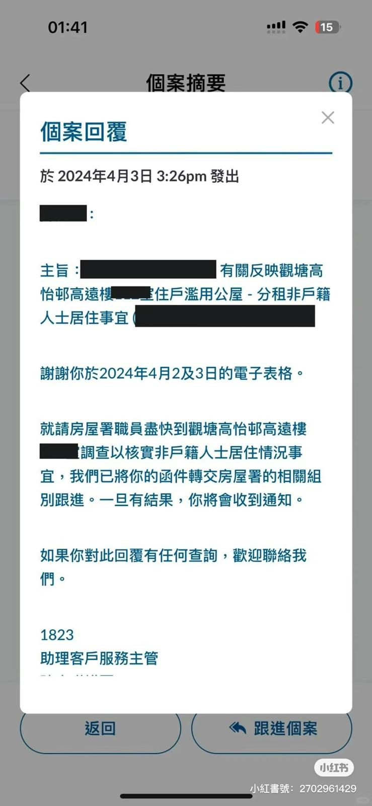 该24岁男子于小红书发帖时,直言“把我父母骗政府的东西举报了”,并附上房署的个案回复截图,根据相片,他分别于4月2日及4月3日提交房署电子表格,举报居住于观塘高怡邨高远楼某单位的父母滥用公屋单位,将单位分租予非户籍人士居住,促请房署尽快到该单位调查、核实违规事宜。该男子亦有上载房署回复邮件,以证明他确实有提交举报表格。