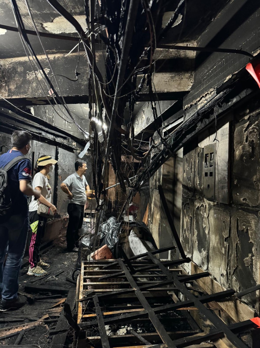 她提供的短片所见,一楼宾馆烧得熔熔烂烂,走廊熏黑,地上积满污水,杂物烧成焦炭,假天花塌陷,大批电线烧剩铜线,一束束悬空挂,大门烧焦起泡,满目疮痍。