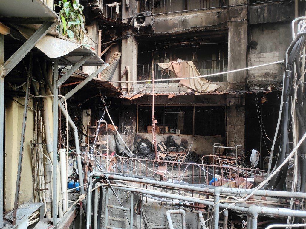 ▲靠近天井火场的一至三楼走廊及单位严重焚毁,满目疮痍。