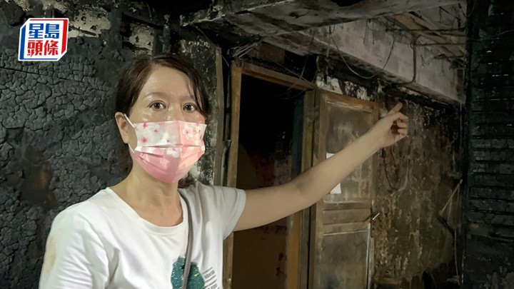 ▲叶小姐带记者视察大厦焚毁情况。 林思明摄