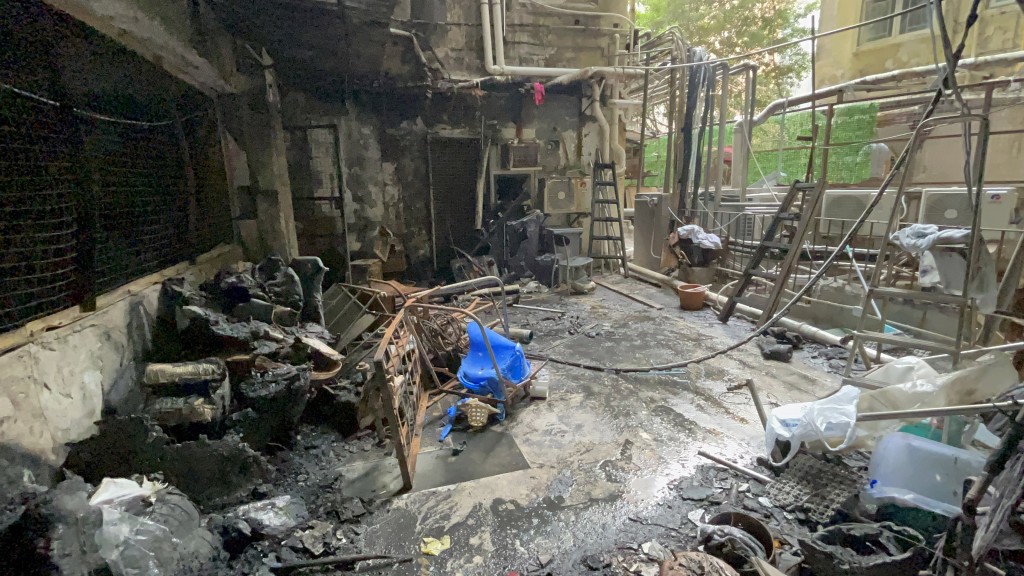 叶小姐带记者视察大厦焚毁情况,一楼损毁最严重,曾有电线烧着爆炸,波及走廊一些电动单车,现场已清走许多杂物,并找了专人维修,期望短期内尽快做好大厦维修及消防事宜。