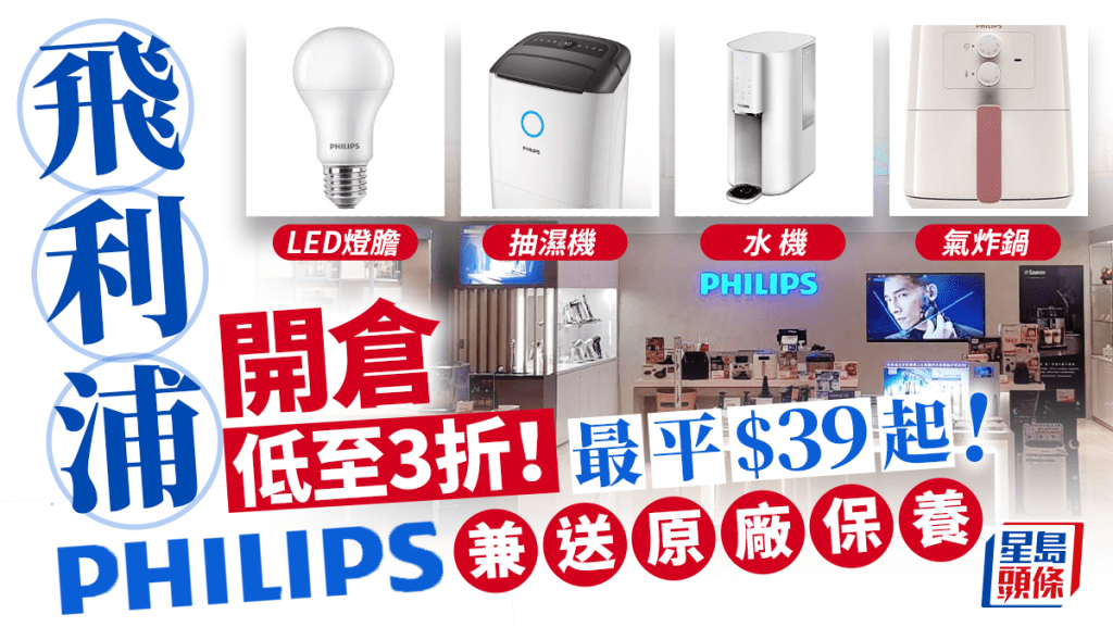 飞利浦(Philips)举行陈列品开仓将于4月24日至27日举行,涵盖多款小型家电、按摩用品、个人护理及滤水器等,部分低至3折发售,附设半年原厂保养;买满指定金额更可获赠按摩器及饮水机等,详情即看下文。