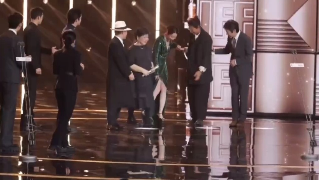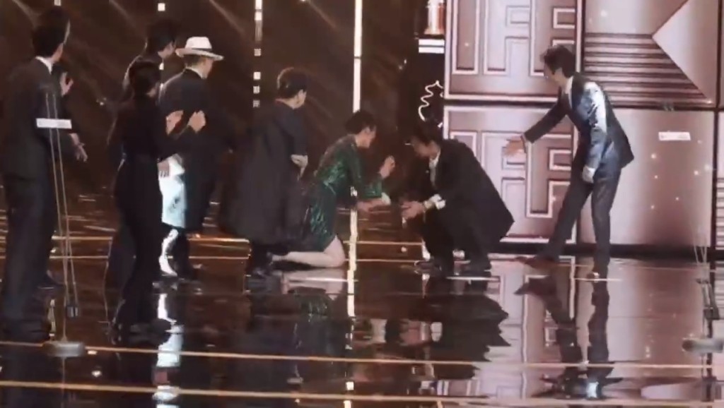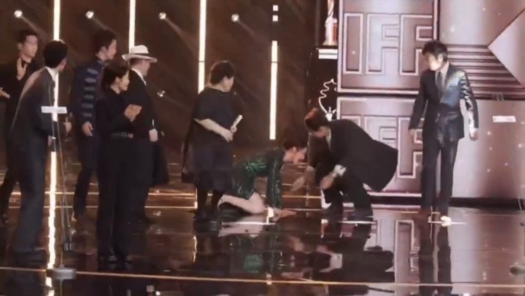 蒋勤勤昨天身穿一袭绿色Deep V高衩晚装,配高跟鞋优雅现身,她与其他《草木人间》的台前幕后一排人出场前,却在台上不慎失足跌倒,由于蒋勤勤的长裙前面非常高衩,直播画面见到她疑似走光的场面。而其后网上流出的片段,则已加上巨型公仔遮掩。见到蒋勤勤意外跌倒,身旁的人都急忙上前搀扶。蒋勤勤仍不忘保持冷静,脸上也维持笑容,事后她在微博上发文报平安,“没有受伤,请大家放心!不会耽误接下来的短片评委工作的。”心中依旧挂念工作,被赞十分敬业。影片曝光后,网民都纷纷留言表心痛:“看起来摔得好痛”、“看着好痛,这地拖得太亮才滑倒吧”、“地板太滑了,要小心啊”、“吓一跳,姐不严重吧”。