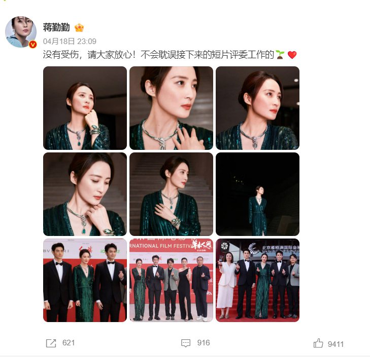 ▲事后蒋勤勤在微博上发文报平安,“没有受伤,请大家放心!不会耽误接下来的短片评委工作的。”