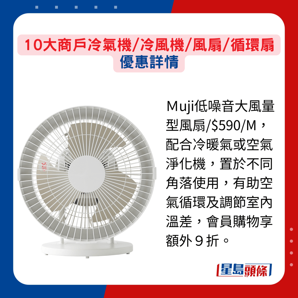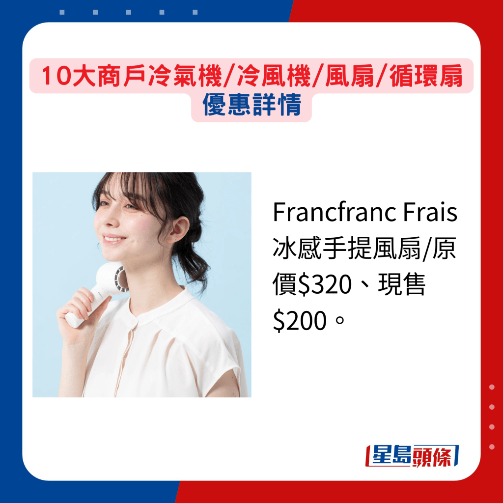 另由即日至4月28日,Muji无印良品专门店及网店同步举行会员专享活动,选购手提风扇或家居风扇皆可享额外9折。 同样日系的Francfranc专门店及网店,由即日至4月30日,选购指定产品满3件,即享9折,当中包括冰感手提风扇及便携式风扇。