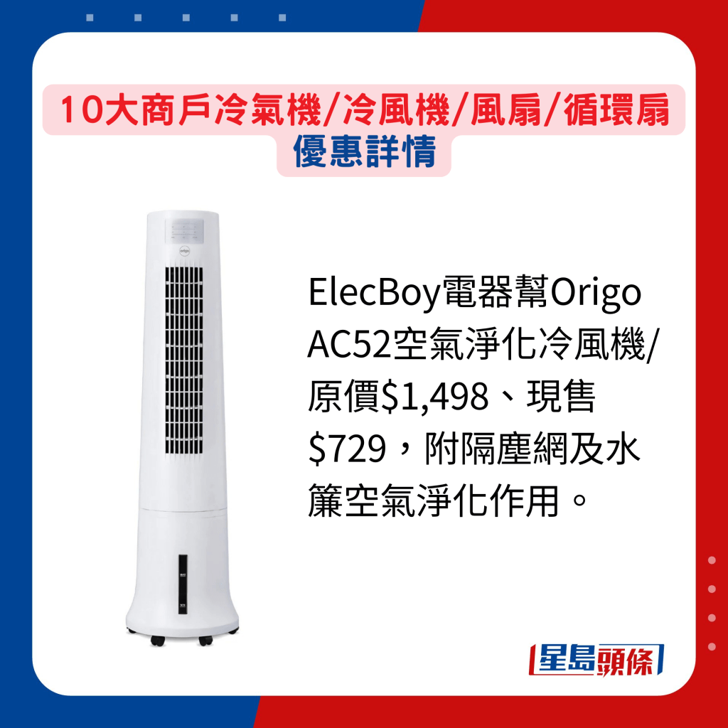 除风扇以外,冷风机在近年大行其道,原理是热空气透过水帘带进冷风机内,并转化成凉风,从而达到降温效果,惟降温范围局限于出风口。 若想入手冷风机,现可趁有信用卡优惠购买更划算。 轻电器网购平台电器帮ElecBoy由即日至4月30日举行购物节,逾千款商品低至4折,若以指定信用卡签帐及输入优惠码,更可享高达总值$190的银行购物优惠,若同时加购TotalCover延长保养服务即享限时9折,另还可以低至47折加购指定产品。友和亦有推出多项信用卡优惠,其中包括逢周五及周六以Mastercard单一消费满$1,500及输入优惠码即减$80。