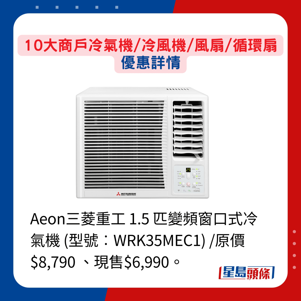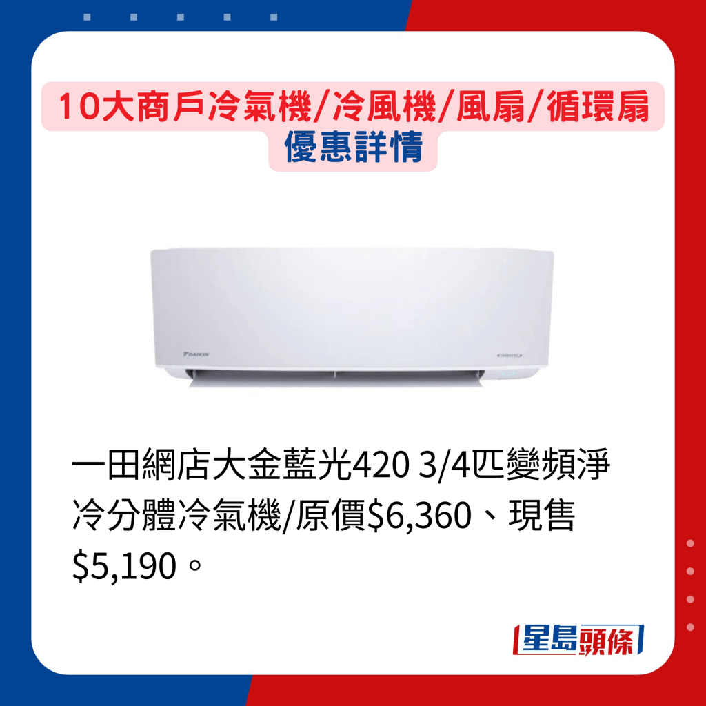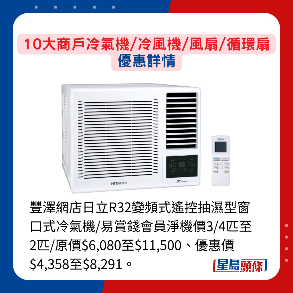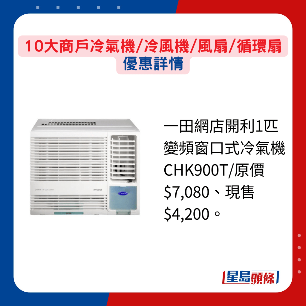 买冷气机,须考虑安装位置而决定选择分体式或窗口式型号之外,也要顾及房间或客厅的面积而决定匹数多少。 另要留意冷气机的能源效益标签共分为5级,1级为最佳,环保节能兼省电。 若心目中已有头绪,就要比较不同商户的推广优惠,提升性价比。 一田百货的春日购物赏虽于5月才开锣,但官方eShop就由即日至4月22日率先发售逾千件笋货,当中正包括冷气机,其中开利1匹变频窗口式冷气机原售$7,080,现减至$4,200。 另单一订单满$1,000更可享免运费。 至于丰泽网店,部分指定型号冷气机都有提供折扣,现凡购买任何品牌及型号冷气机,更可获赠价值$299的Cuisinart微波环保便当盒套装。