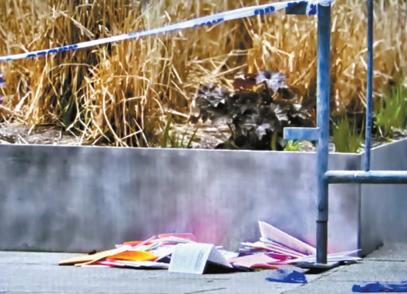 ▲自焚事件后,现场发现该男子向人派发的“反政府阴谋论”传单。电视截图