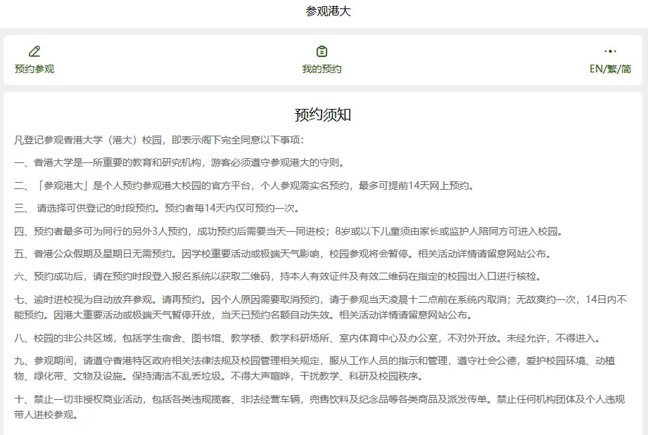 每节参观时段为两小时,均设有名额上限。预约成功后,到访游客将获得入场二维码,并须通过指定地点进出港大校园。