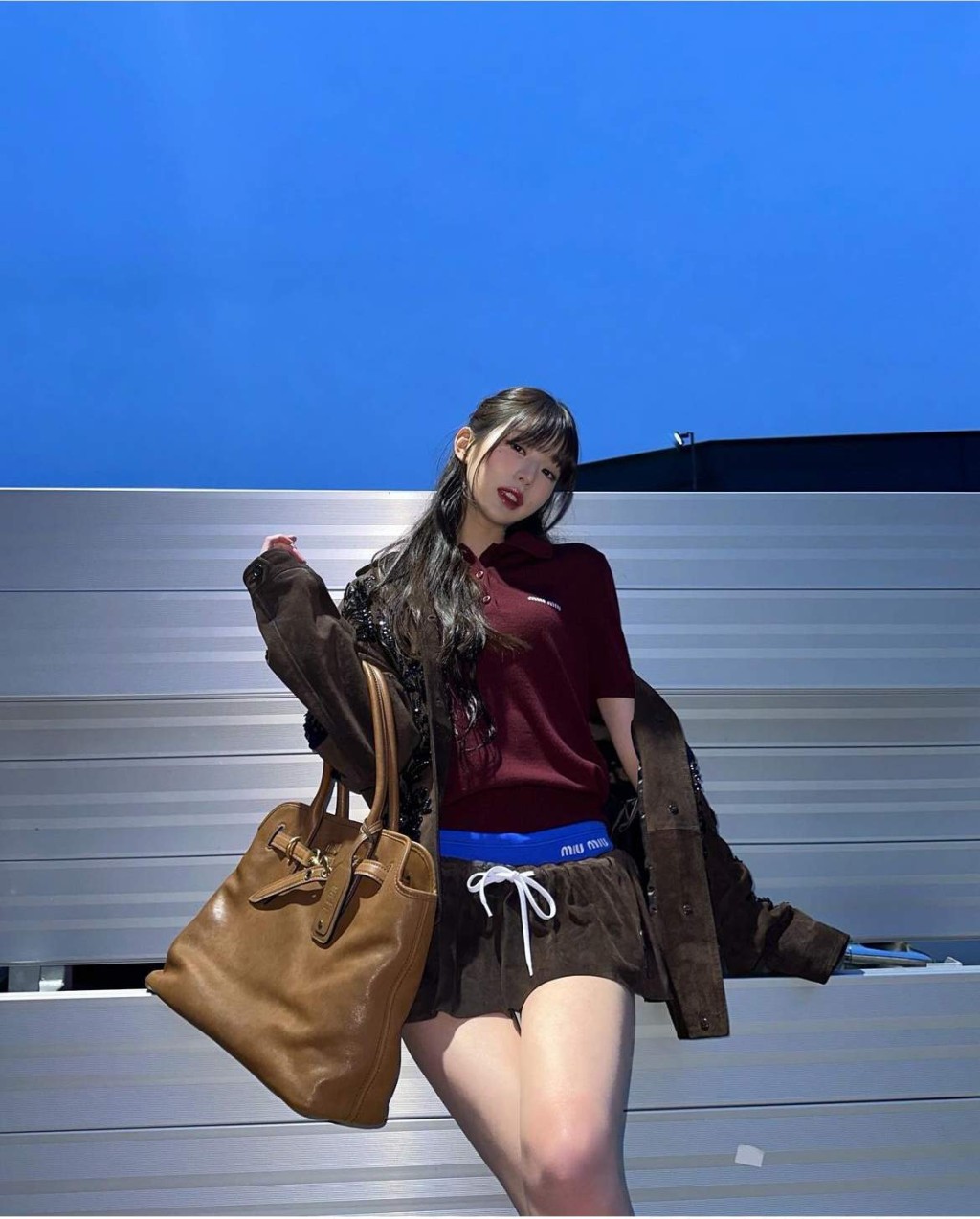 ▲韩团IVE成员张员瑛以Polo衫衬束绳迷你裙,再配以大号皮革Tote Bag,造型刚柔兼备。(图片来源:IG@for_everyoung10)
