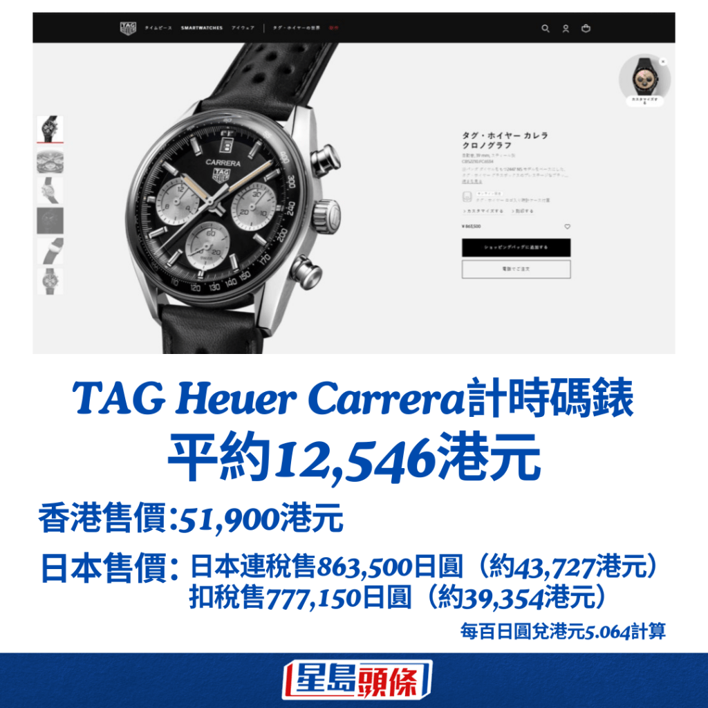 据彭博报道,越来越多来自欧美国家的观光客前往日本,利用汇率差异入手各种商品,包括高单价的奢侈品。以TAG Heuer Carrera(卡莱拉)运动腕表为例,东京专卖店售价为777,150日元(以每百日元兑港元5.064计算,约39,354港元),相比纽约店铺标价6,450美元(约50,500港元)平11,146港元,比香港定价51,900更平约12,546港元。