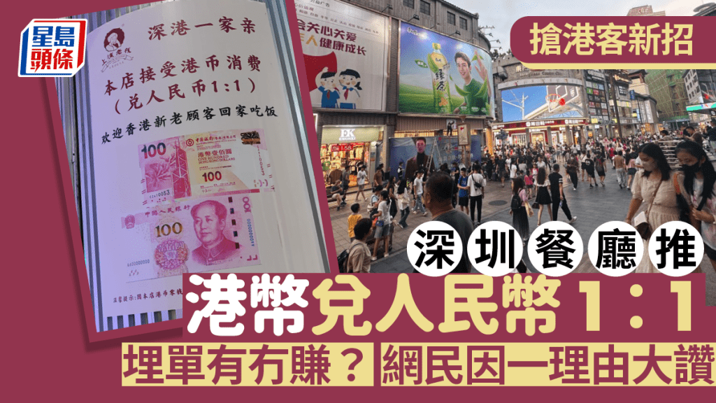 最近有网民在Facebook群组”香港店铺消息(开张/执笠)关注组”发帖,甫开首大叹:“已经水深火热,死多二钱!!”,并附上一张日前在深圳连城广场地下街拍摄的照片。 从相片中所见,有餐厅的宣传海报上写有“本店接受港币消费(兑人民币1:1)”及“欢迎香港新老顾客回家吃饭”,底部又注明港币零钱有限,“不收500及1000港币”。