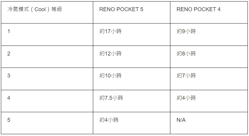 不只第4级冷气模式使用时间大幅延长,事实是RENO POCKET 5每个等级的续航都比上代高出不少,只开1级的话,续航力竟达到17小时,2级亦可用足12小时,值得留意的是,RENO POCKET 5的冷气模式新设最高第5级,制冷效果进一步加强,在35℃高温环境使用5分钟,可将身体表面温度降至23℃,这个最强的制冷模式可连续使用4小时。跟过去两代一样,RENO POCKET 5在USB供电情况下,可将制冷效果再提升至第5+级。