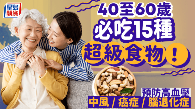 40岁、50岁及60岁以上人士,宜吃什么食物保健养生,以防“无声杀手”?年纪渐长,要多吃果仁?有营养师提醒,不同年龄或性别的人士,身体出现的变化不同,需要摄取的营养也不同。 她推介15种超级食物,适合3大年龄层人士,以预防常见的高血压、中风、癌症、脑退化症等问题。
