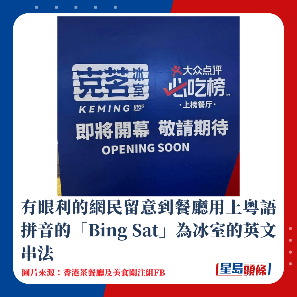 随住近年内地餐饮业攻港热潮,克茗冰室亦加入战团,有网民发现有尖沙咀宝勒巷一间酒店地下封上围板,表示克茗冰室快将开业,并加上“大众点评必吃榜上榜餐厅”作卖点。 有眼利网民留意到餐厅用上粤语拼音的“Bing Sat”作为冰室的英文串法,与其“克茗”普通话拼音有点格格不入,加上香港鲜有餐厅用上粤拼作英文,引来网民笑指“我真系唔明”。