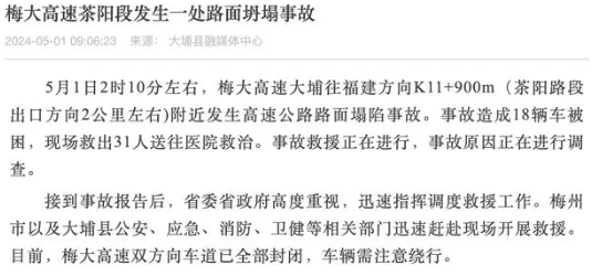 5月1日早上,梅州市公安局交警支队发布交通绕行提示,广东梅龙高速(S12)梅州往福建方向K11+900m道路塌陷,双向封闭,车辆需绕行。大埔县融媒体中心发布消息,事故造成18辆车被困,现场救出31人送往医院救治。