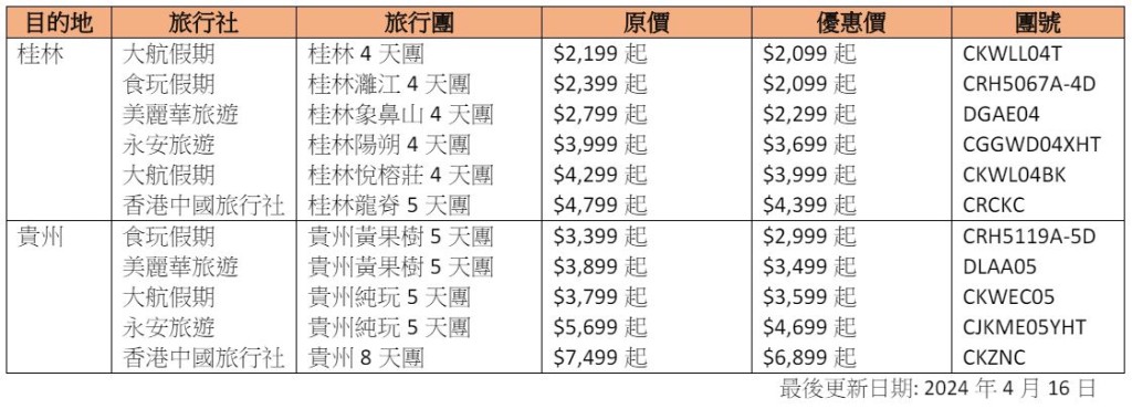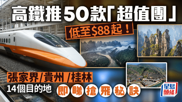 高铁日前推出50款高铁旅行“超值团”优惠,当中包括张家界、贵州、桂林等国内14个目的地,惊喜优惠价更低至$88起,包括深圳1天团$88起、江门2天团$699起、桂林4天团$2099起等。无论喜欢沿铁路欣赏景色、品尝各地风味美食或快闪深圳大型超巿扫货,都有旅行团适合你!