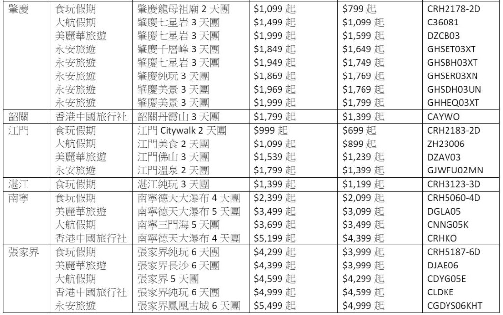 指定旅行社:大航假期、香港中国旅行社、食玩假期、美丽华旅游、永安旅游