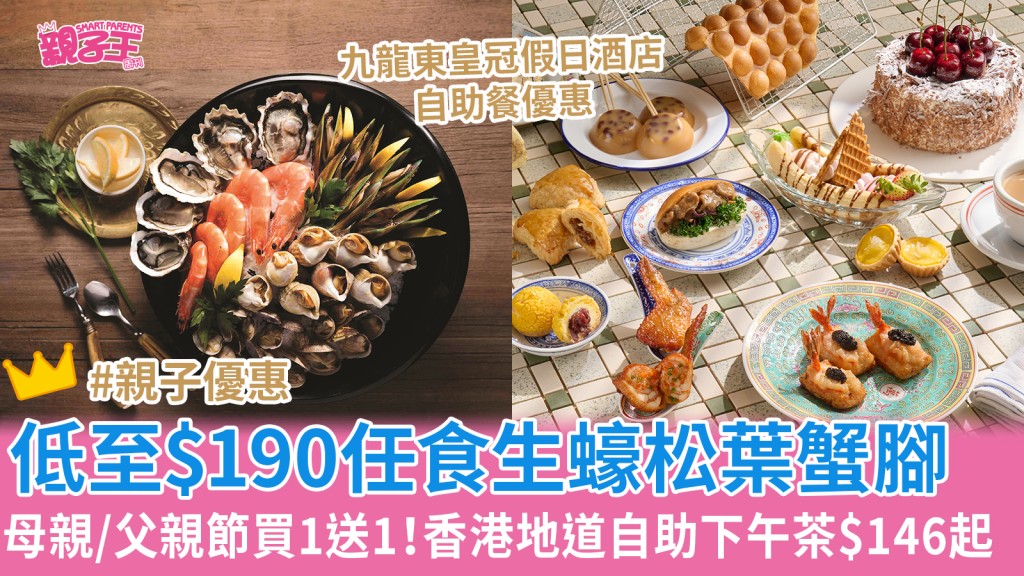 想母亲节、父亲节一家大细找个舒舒服服又多不同菜式选择的地方用餐,酒店自助餐就是最佳选择。 今日(2日)中午12点就有九龙东皇冠假日酒店自助餐优惠买一送一,只需$190起即可大叹生蚝,小朋友又可尽情吃多款口味Haagen-Dazs雪糕与朱古力喷泉!自助晚餐更有松叶蟹脚、芝士焗龙虾,都只是$326起;必试低至$146全新“香港地道”周末下午茶自助餐,父亲节、母亲节亦有买一送一优惠,更每位母亲/父亲送木瓜炖燕窝或 心太软伴威士忌雪糕。 即睇自助餐优惠详情及快抢连结。