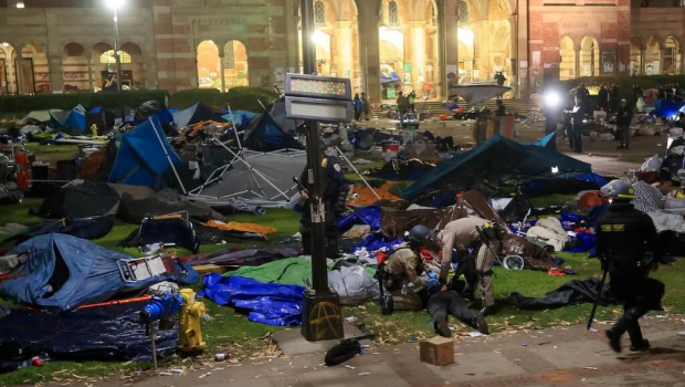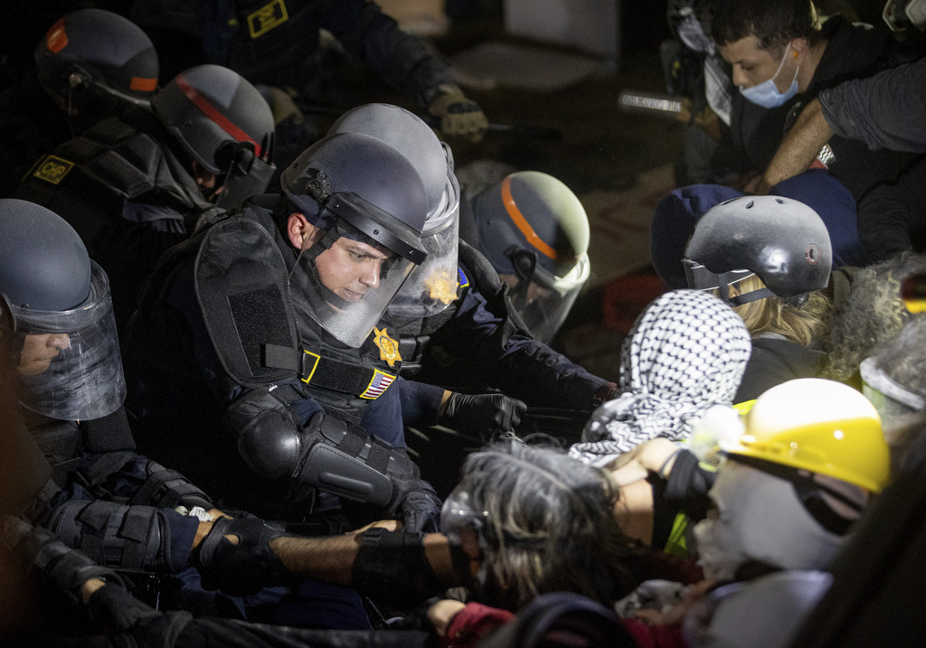 综合美联社及路透社报道,周四凌晨时分,数百名穿着头盔的警察,以扩音器警告,若示威者不散去,就会被逮捕,并敦促示威者清理抗议区。警方在外校集结数小时后,大约凌晨3时许采取行动,进入加州大学洛杉矶分校,一字排开推进,并拆除校内支持巴勒斯场示威者的路障及营地。据报,警方向示威者投掷闪光灯,示威者则手牵手阻止警方前进,有示威者与警察发生纠缠。