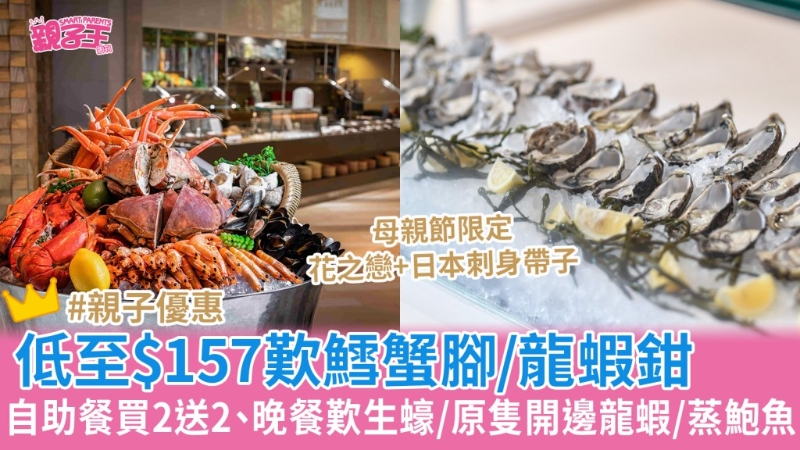 母亲节快到了,如果妈妈是海鲜控就要留意今日(3日)中午12时香港康得思酒店The Place自助餐有买二送二优惠!以海鲜做主打的自助餐均享买二送二优惠,周末下午茶自助餐只需$157即可品尝品尝龙虾钳、鳕蟹脚等,2.5小时午餐低至$217,3小时晚餐低至$424,即可任食龙虾钳、鳕场蟹蟹脚,自助晚餐更有生蚝、原只开边龙虾、面包蟹、 蒸鲍鱼,母亲节更限定推出限定花之恋、龙虾沙律酥皮盒配三文鱼籽、日本刺身带子,即睇自助餐优惠详情与预订连结,一家大小尽情去吃海鲜。