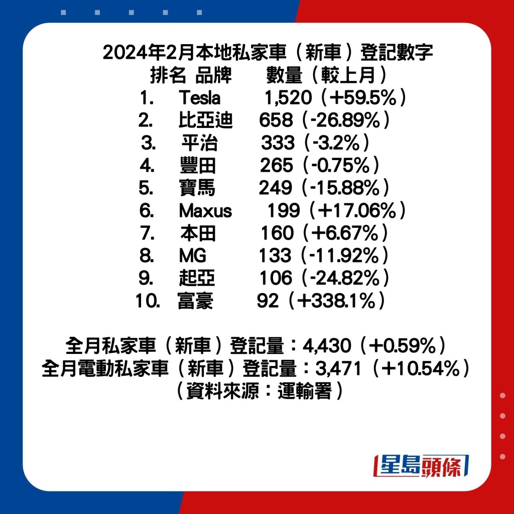 运输署公布了2024年2月份本地车市统计数字,全月私家车(新车)登记量是4,430辆,较1月份微升0.59%,同比(3,891辆)则增长13.96%。另外,2月份电动车交投量达3,471辆,市占率进一步破顶攀升至78.35%,Tesla强势领风骚。