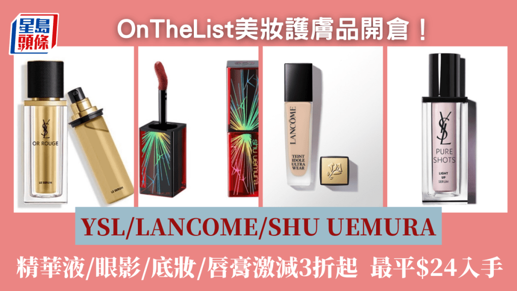 OnTheList美妆护肤品牌开仓优惠低起3折!由即日起至5月12日,OnTheList购物平台网站推出美妆护肤品开仓大减价,L'Oréal旗下化妆品牌包括YSL、LANCOME、植村秀SHU UEMURA等,多款护肤精华液、眼影、皇牌唇膏以3折起发售,想趁减价为化妆品及护肤品换季,记得留意优惠详情!