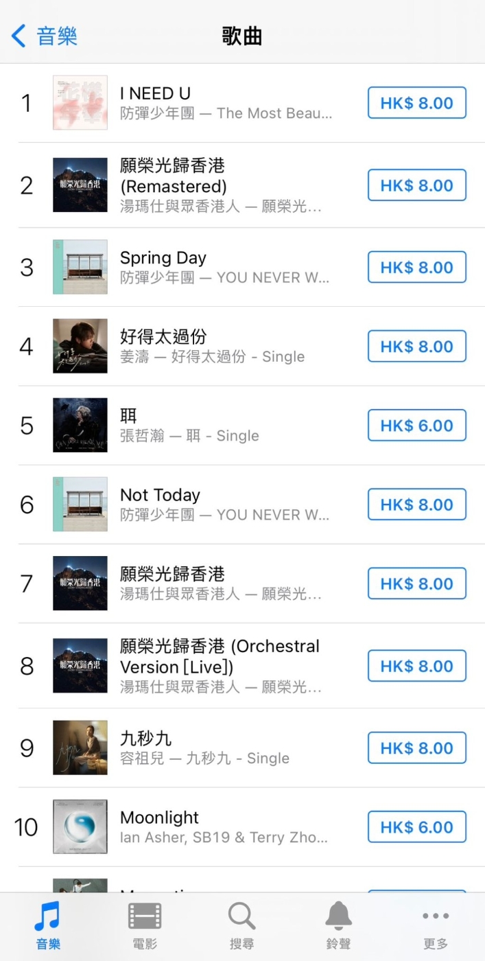 《星岛》记者浏览各大主流音乐平台,发现《愿荣光》在iTunes、KKBOX、Spotify均未下架。
