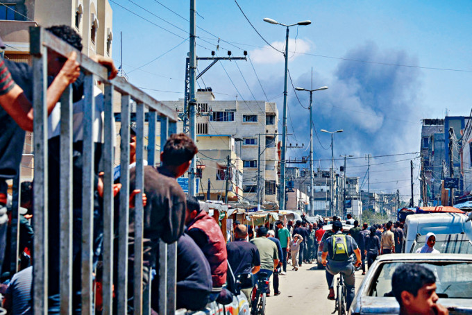 ▲以军空袭加沙南部城镇拉法,人群聚集的街道不远处冒出浓烟。