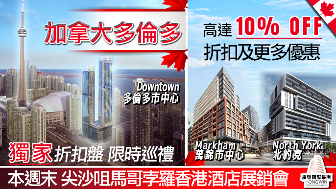 说到加拿大移居、升学或地产投资,不少人第一时间都会想到多伦多,而其中位处市中心繁华地段,邻近学校和商业区的项目,更加有价有市。 今个周末于尖沙咀展销的多伦多金融中心及大学区黄金地段项目,展销期间平均折扣有高达10%,同场亦会介绍约克地铁盘及万锦市中心项目,值得留意!