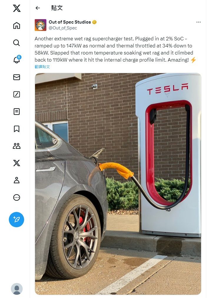事实,不少Tesla车主分享了使用湿毛巾前后的充电功率变化,其中一位成功由60kW提升至95kW,另一位则在电量仅剩2%时才充电,初时功率高达147Kw,当充至34%时因过热而降低至58kW,结果放上室温湿毛巾后,功率随之回升到119kW,效果显著。 不过这方法只适用V2超级充电站,换上V3降速的话,湿毛巾对差不多所有Tesla电动车都没用,除了Cybertruck,有指可能是此型号属800V底盘,目前美国的超级充电站均无法提供800V电压,故电池组分成2个400V单元,令电流提升至700A以上,有机会令内置主动冷却的充电线手柄变热,从而让湿毛巾可在Cybertruck派上用场。 怎样也好,湿毛巾一定程度改善充电速度,但非正统解决方法,当电量接近100%时,功率仍会降低。 至于部分车主提出的安全问题,只可说超级充电站设计是下雨时仍可安全使用,但官方并不认可,车主得自行承担风险。