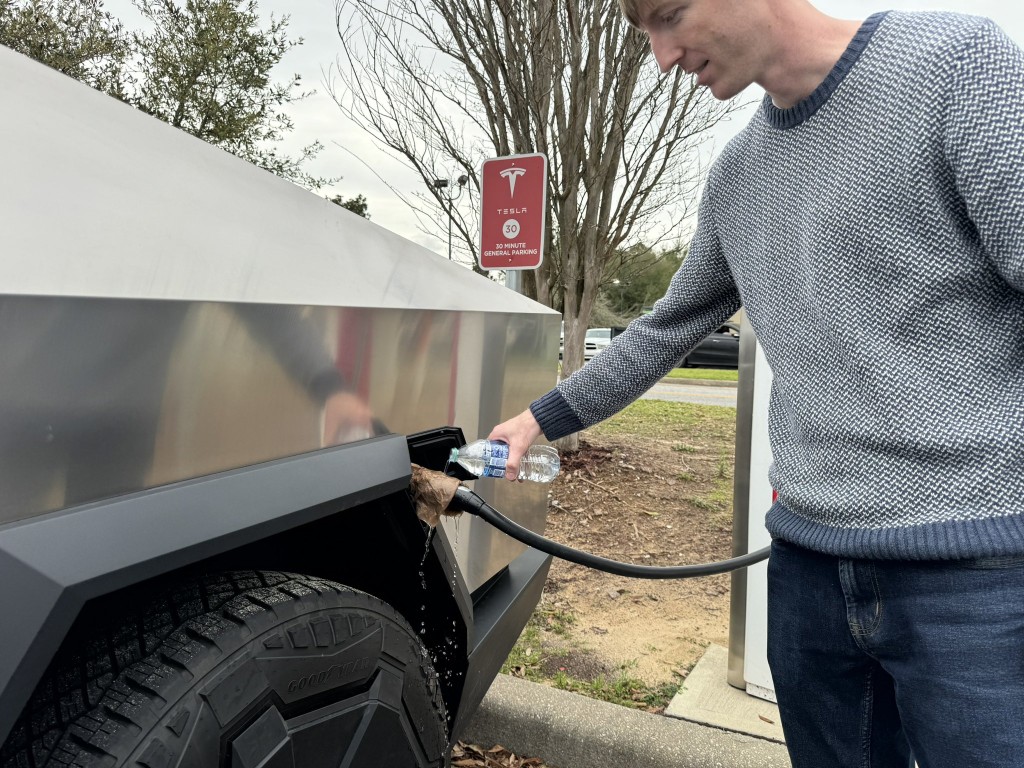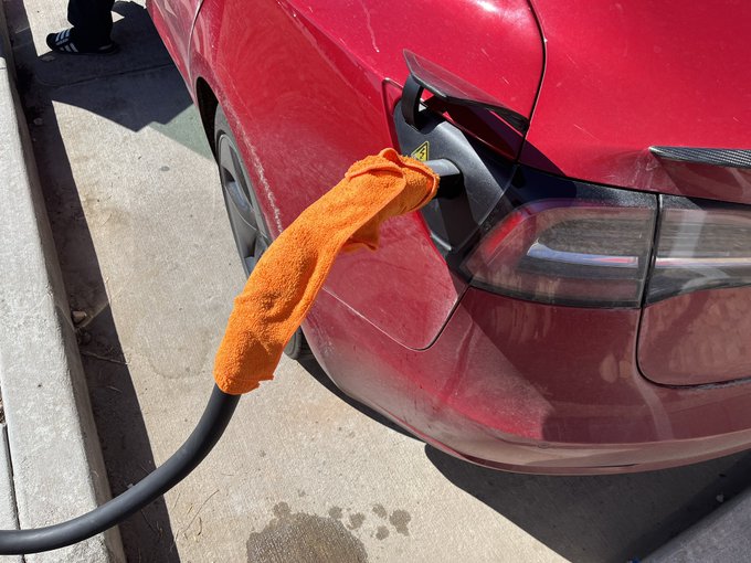 ▲Cybertruck车主使用V3超级充电站时,也利用湿毛巾减低手柄过热。