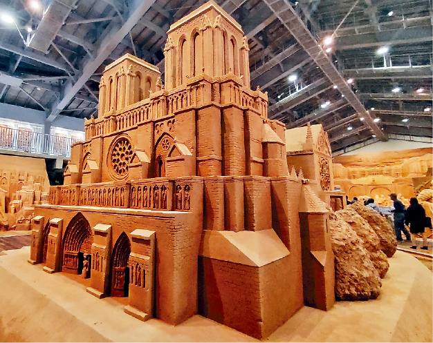 ▲现在来到鸟取砂之美术馆,可看到巴黎圣母院大教堂模样的砂雕艺作。