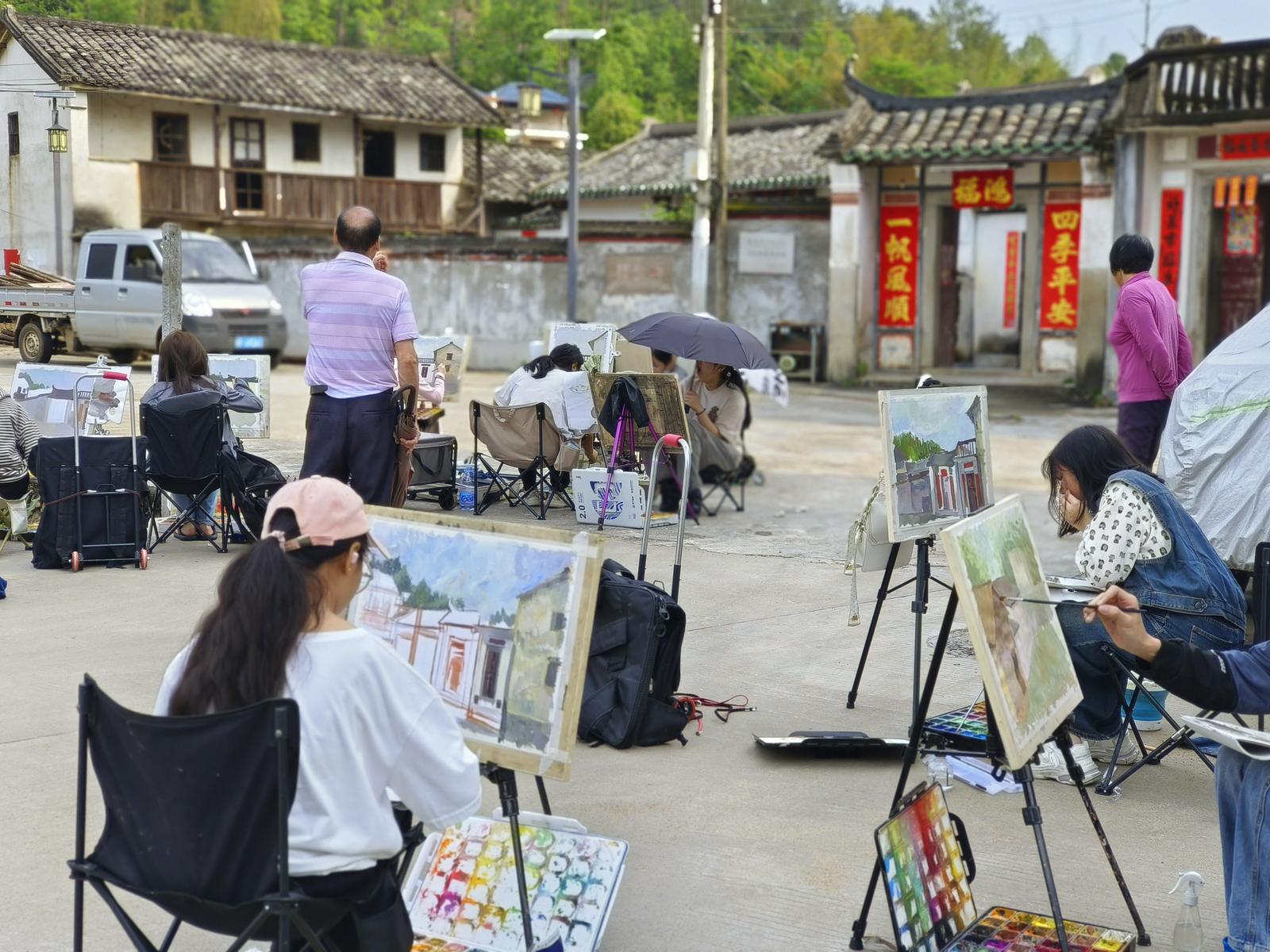 漳溪河畔的梅州大埔西河镇北塘村,从宋末元初建村到现在已有800多年历史。五月的几场雨过后,漳溪河畔的竹林越显青翠,水田里的禾苗,山坡上的野花,村道旁的围龙屋,散步的村民……构成了一幅美丽的乡村图景,这些刚好被前来写生的画家们描绘在了画板上,似有“你在桥上看风景/看风景的人在楼上看你”的意境。