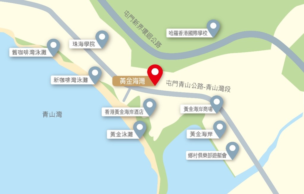 青山湾坐拥新界西北最长的海岸线,五大泳滩黄金泳滩、旧咖啡湾泳滩、新咖啡湾泳滩、加多利湾泳滩及青山湾泳滩相连,全长逾1公里,充分突显与黄金泳滩仅2分多钟步程的新盘黄金海湾之地利优势。挟偌大优美海景景观,邻近欧陆式建筑风格的黄金海岸商场及黄金海岸酒店,再加上交通四通八达,多条巴士线往来尖沙咀、旺角、铜锣湾及荃湾,以及转乘港铁约1小时可直达中环和启德两大现今及未来CBD,各方面生活配套规划均非常完善,享受到城中难觅的海岸线写意生活。