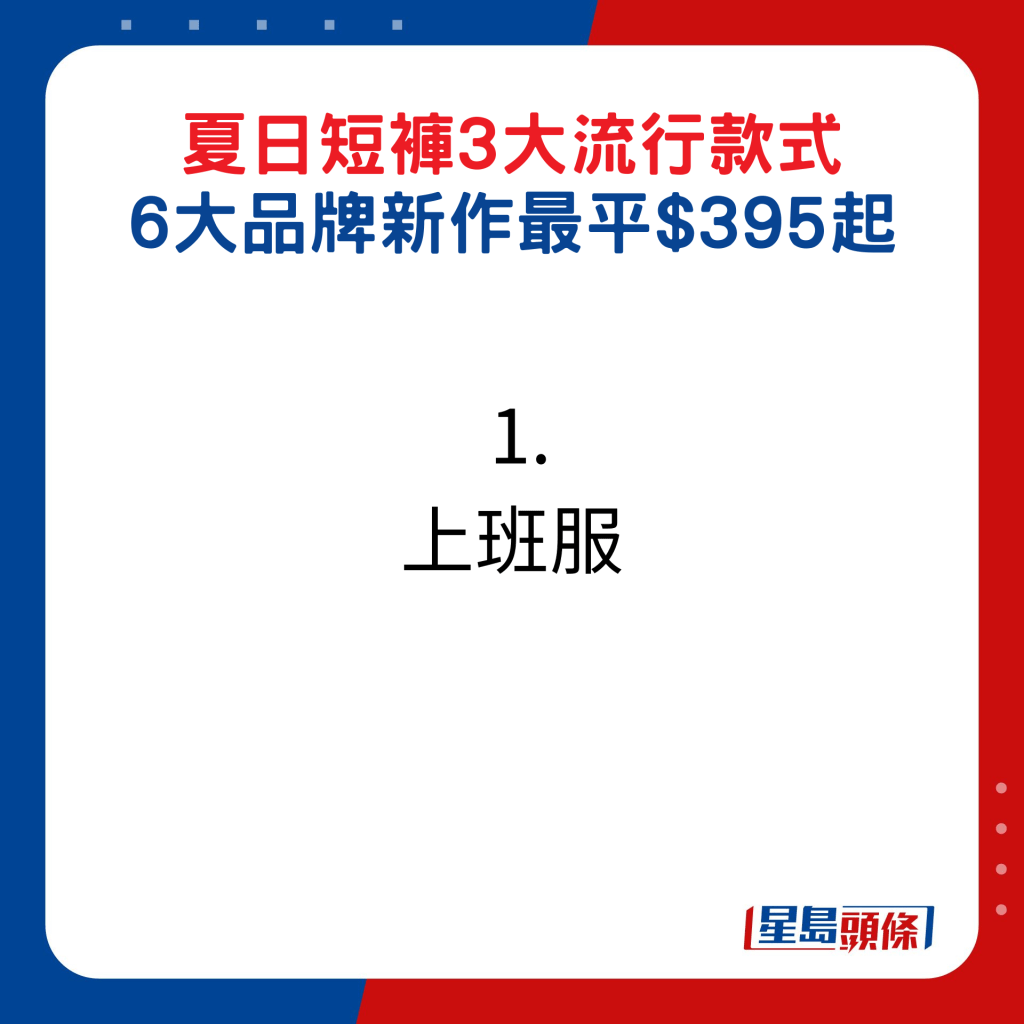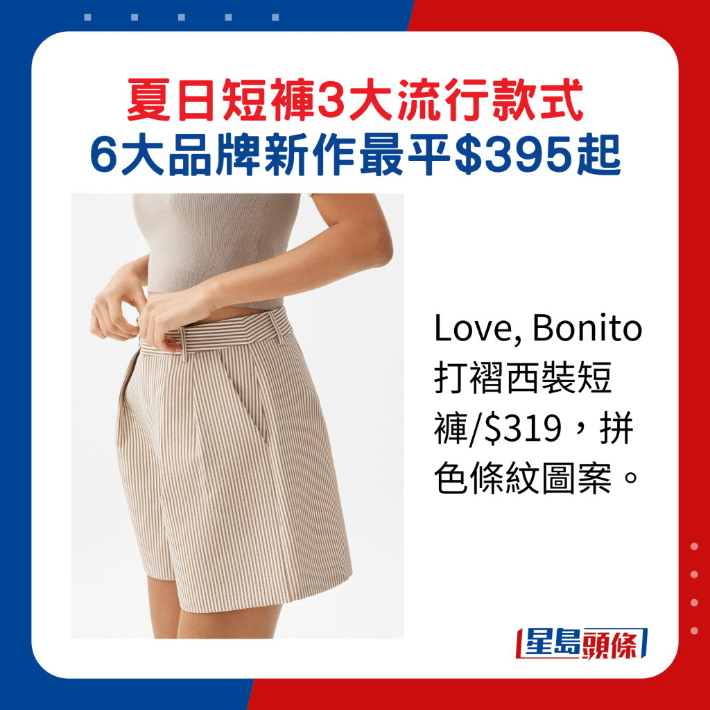 以往上班族似乎难穿短裤返工,但西装配短裤却为今个夏天制造潮流。 来自新加坡的流行品牌Love, Bonito,今季正有推出条子图案西装短裤,饰以打褶细节,以之配衬同色系或同款图案的无袖西装外套或正装外套,都可轻易塑造年轻又时尚的行政OL形象。 若想女性化一点,裙裤则是不错之选,Maje的净色设计裙裤,附设实用口袋,方便又百搭,同时展现女性柔美一面。