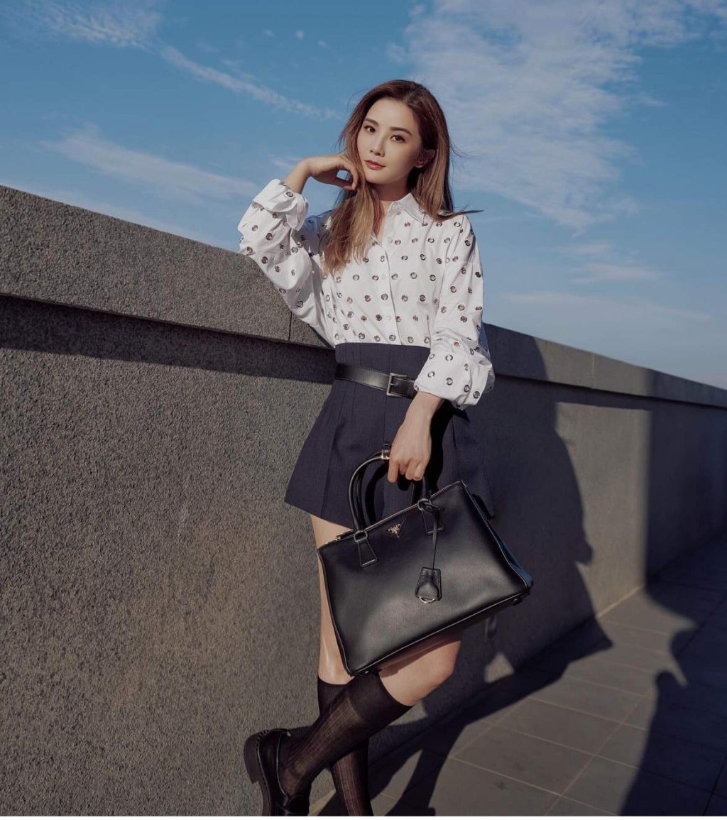 ▲阿Sa蔡卓妍穿着恤衫下衬打褶高腰短裤,配搭黑色丝袜及皮鞋,展现上班造型的时尚魅力。 (图片来源:IG@choisaaaa)