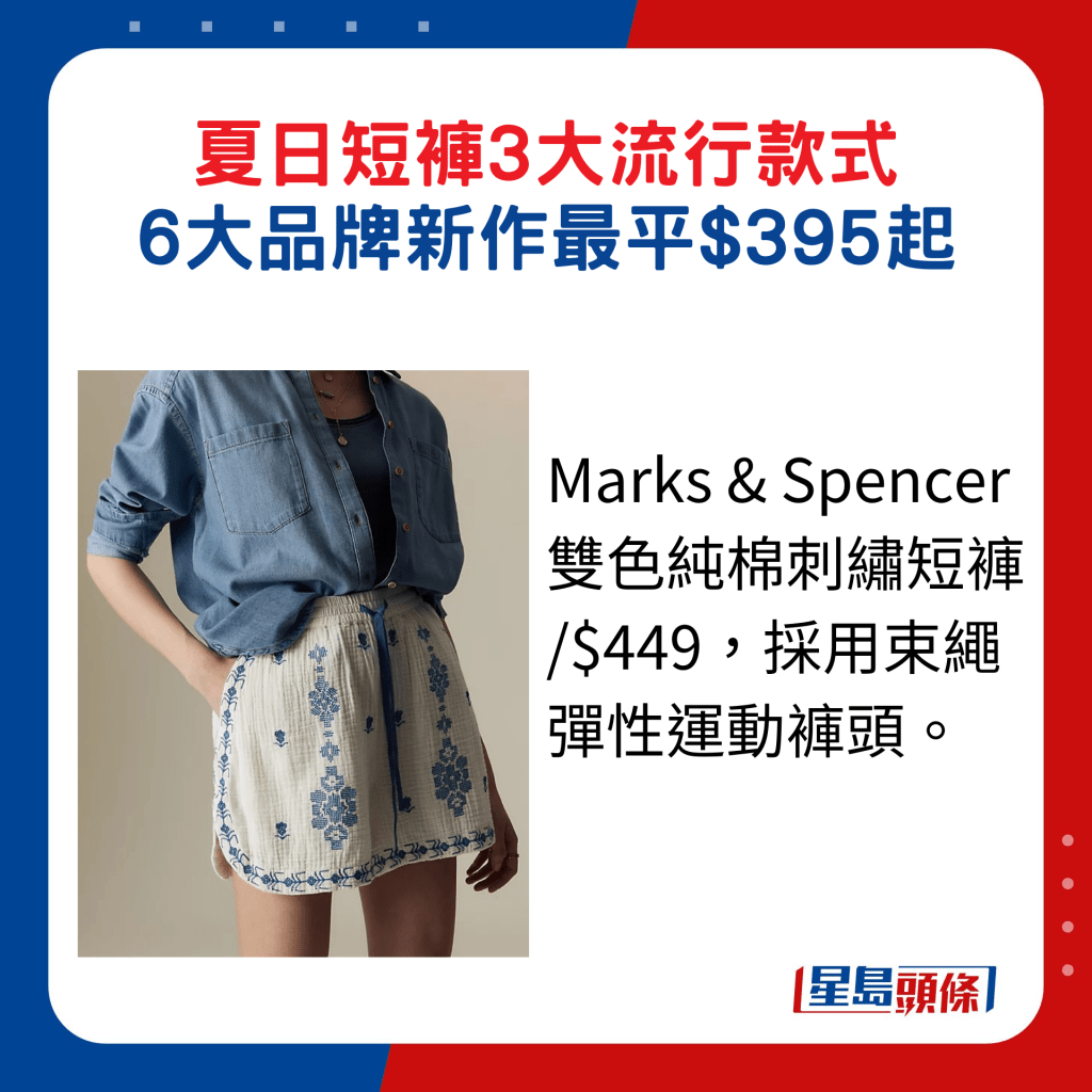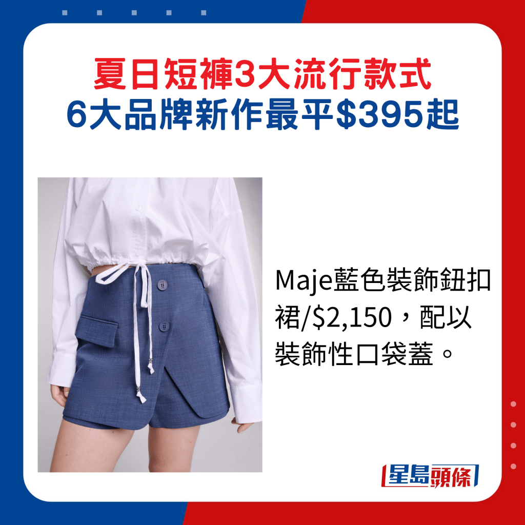 短裤穿搭可凸显双腿的修长线条,好像BLACKPINK成员Lisa就以超短牛仔热裤配搭白色短身上衣及长靴,营造极佳的身形比例,更显型格。 想为造型加分兼且修饰双腿,不妨挑选一些饰以精致细节的款式,如Maje新推的Denim系列便以水钻及珍珠作装饰,其中牛仔短裤的裤边缀上水钻流穗,华丽之余,走动时也倍添动感。 此外,Marks & Spencer今季亦有推出工装短裤及亚麻混纺高腰短裤等,当中亦有以Sport Shorts为蓝本设计的款式,饰以复古蓝色花卉图案,又或以通孔勾织图案配搭波浪裤边,夏日休闲造型必备。