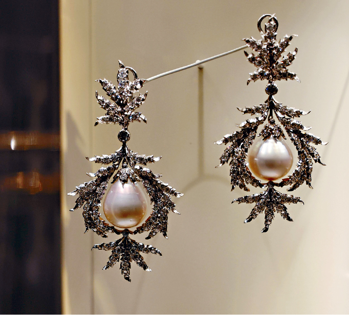 ▲这对珍珠钻石耳环,充分展示装饰艺术的色彩,以白金镶嵌2颗水滴形珍珠及254颗圆形明亮式切割钻石。