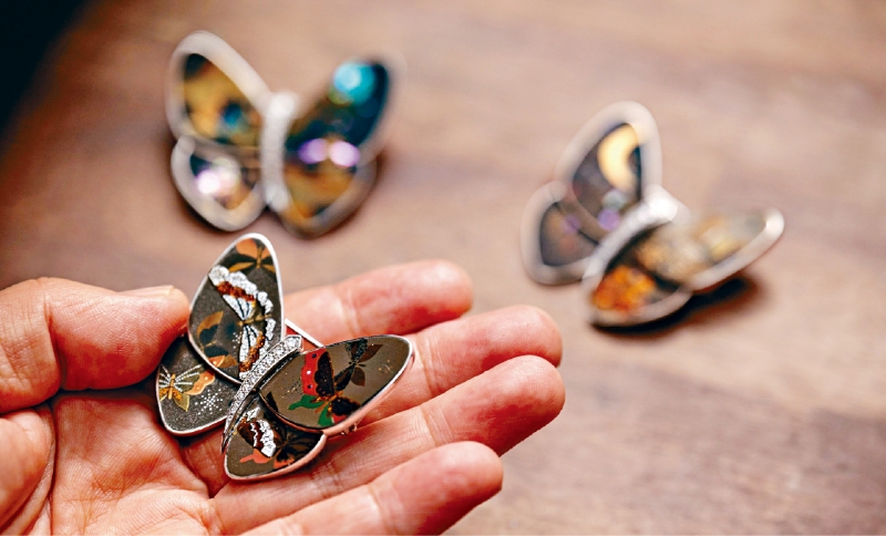 创立于1906年的法国高级品牌Van Cleef and Arpels,其蝴蝶珠宝同样是此珠宝世家的一大经典名作。品牌年前特别将法国装饰艺术与日本古代艺术工艺互作交流,邀来日本艺术家箱濑淳一合作,在其位于石川县轮岛市的工作坊中,以传统手工技艺“轮岛涂”(Wajima-nuri),并加入莳绘(金或银粉)或螺钿等元素,创制出极致珍贵的漆绘蝴蝶胸针。除了日本漆艺蝴蝶胸针作品,品牌亦有不少以蝴蝶为主题设计的高级珠宝作品。