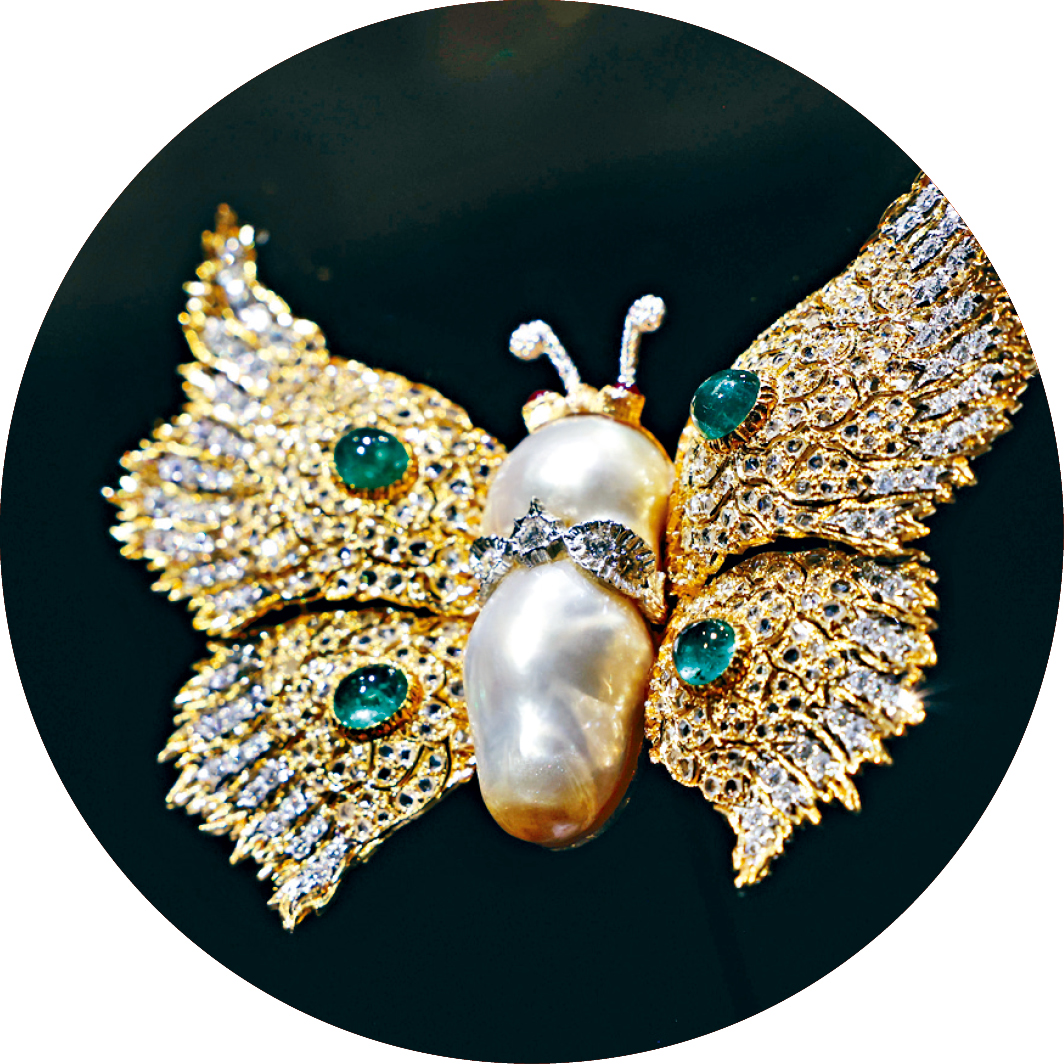 ▲由Mario之子,即品牌家族第二代的Gianmaria于1993年创作的威尼斯蝴蝶胸针,以白金、黄金及玫瑰金镶嵌2颗巴洛克珍珠、2颗圆形蛋面切割红宝石、4颗椭圆形蛋面切割祖母绿及91颗圆形明亮式切割钻石。