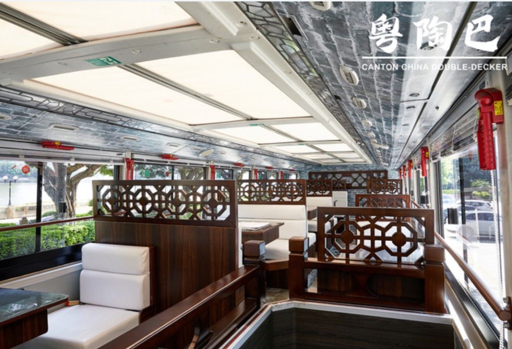 观光巴士内部经过改装,装潢以西关建筑为主题,车内设置卡位座椅,可供2至5人一桌,座椅采用漆木木雕设计,风格典雅古朴,窗帘印有特色玻璃窗“满洲窗”图案,充满广式风情,打卡一流。
