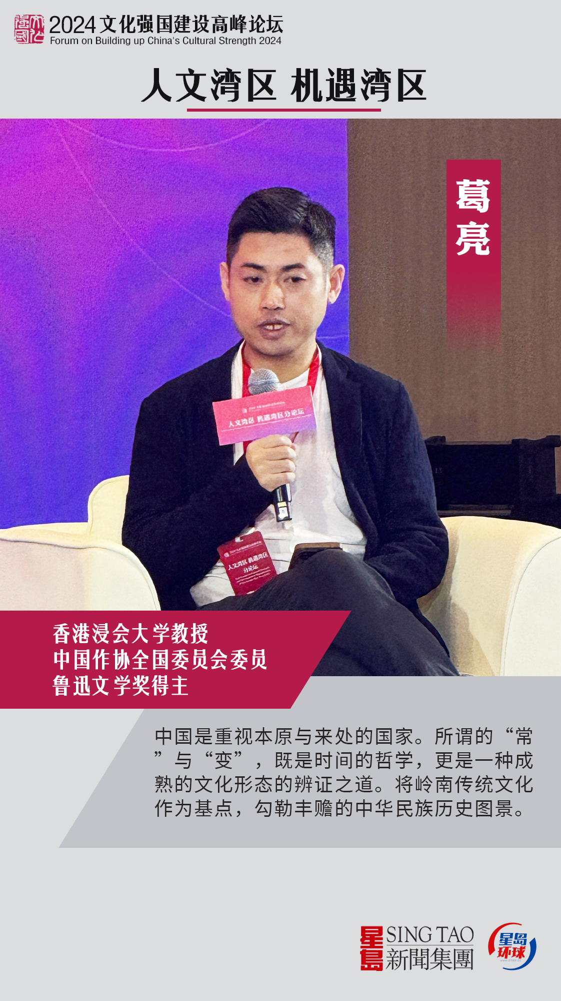 香港浸会大学教授、中国作协全国委员会委员、鲁迅文学奖得主葛亮表示,“中国是重视本原与来处的国家。所谓的“常”与“变”,既是时间的哲学,更是一种成熟的文化形态的辨证之道。将岭南传统文化作为基点,勾勒丰赡的中华民族历史图景。”