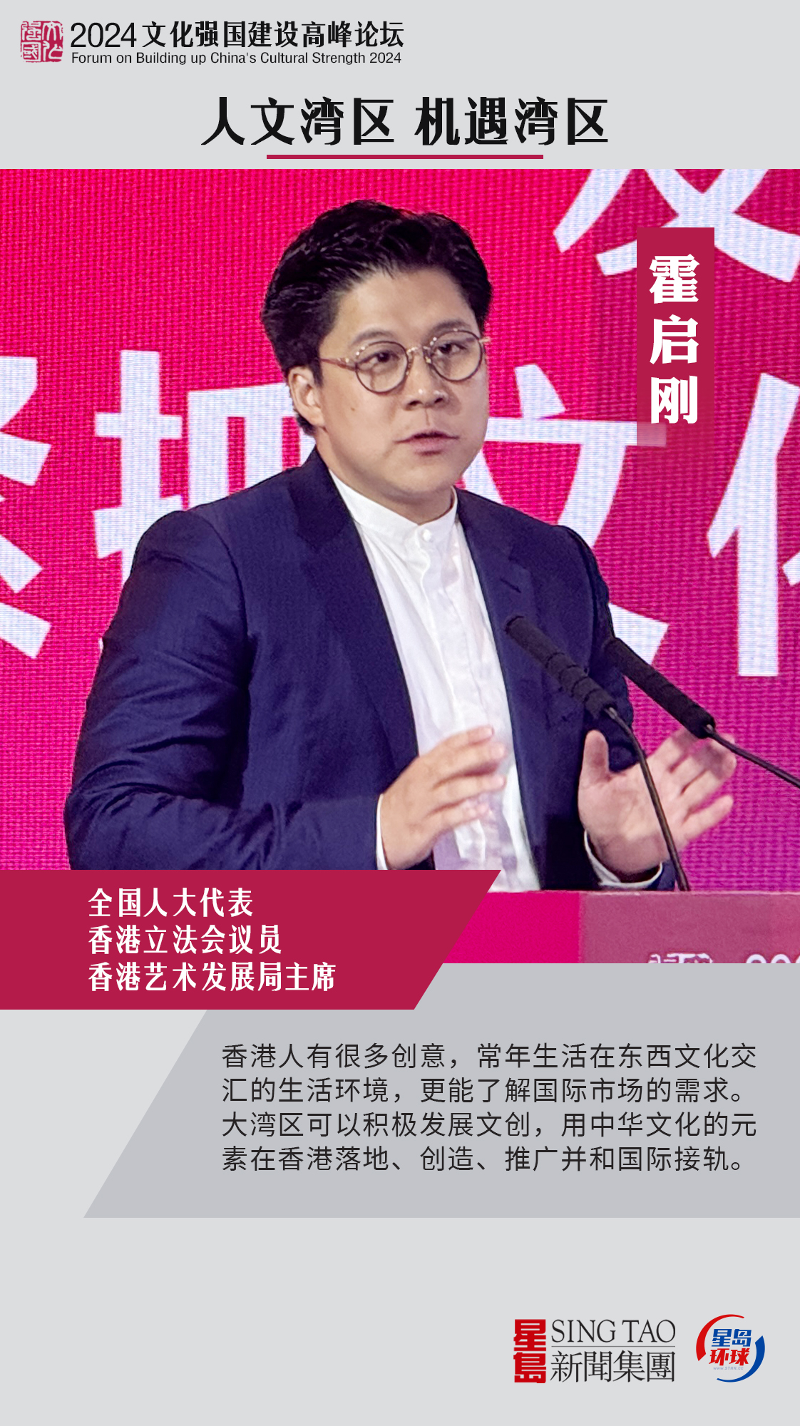 全国人大代表、香港立法会议员、香港艺术发展局主席霍启刚表示,“香港人有很多创意,常年生活在东西文化交汇的生活环境,更能了解国际市场的需求。大湾区可以积极发展文创,用中华文化的元素在香港落地、创造、推广并和国际接轨。”“粤港澳三地有非常深厚的历史文化基础,我们应该把握机遇、善用优势,巩固湾区的文化内涵,推进深度交流合作,把我们的历史、文化、人文精神,让一代又一代湾区人传承下去。”