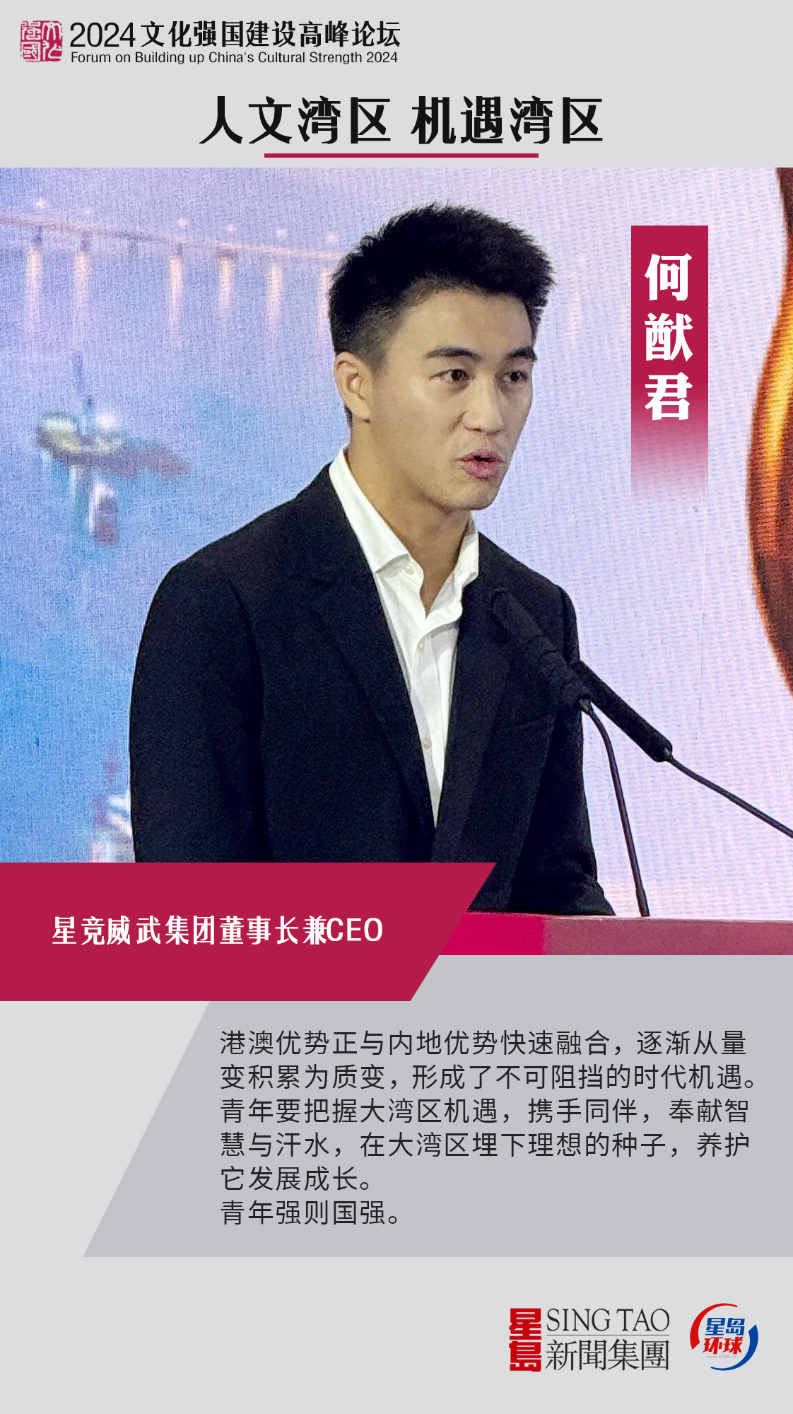 星竞威武集团董事长兼CEO何猷君表示,“港澳优势正与内地优势快速融合,逐渐从量变积累为质变,形成了不可阻挡的时代机遇。青年要把握大湾区机遇,携手同伴,奉献智慧与汗水,在大湾区埋下理想的种子,养护它发展成长。”“青年强则国强。”