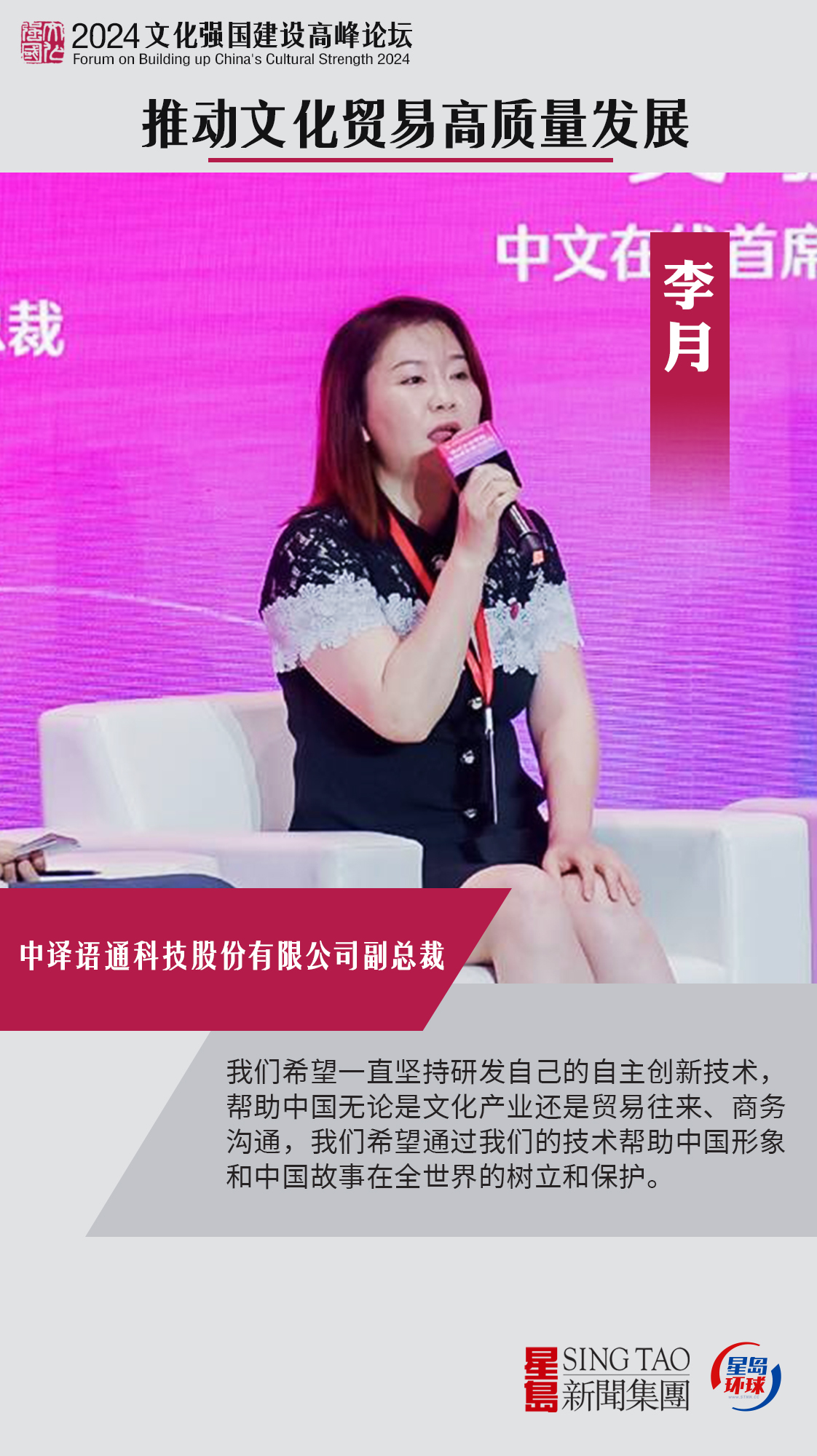 中译语通科技股份有限公司副总裁李月表示,“我们希望一直坚持研发自己的自主创新技术,帮助中国无论是文化产业还是贸易往来、商务沟通,我们希望通过我们的技术帮助中国形象和中国故事在全世界的树立和保护。”